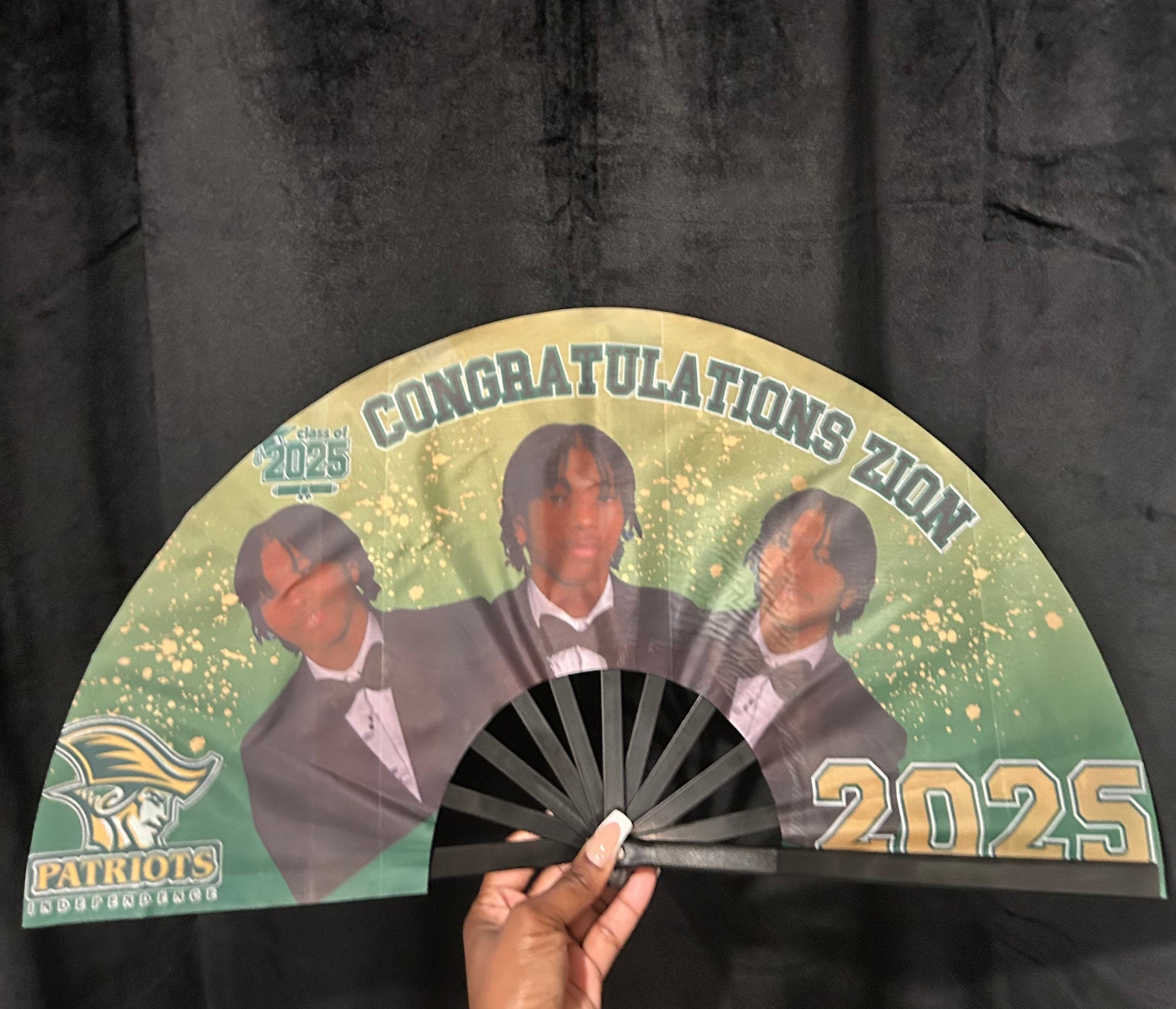 Expertly crafted for both style and function, this large custom clacker fan is 25'' wide when open and 13 inches when closed and delivers an attention-grabbing snap with every flick, ensuring you stand out in every celebration. Personalize it with your GRADS name, picture, school colors, graduation year to create a one-of-a-kind keepsake that commemorates their achievement.